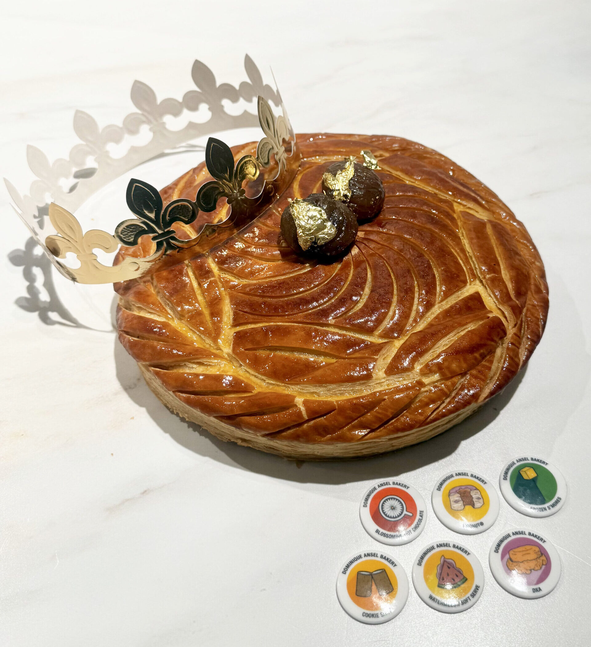 Celebrate Epiphany with our limited-edition Chestnut Galette des Rois. Our classic French “Kings Cake” gets a gourmet twist with chestnut almond cream studded with candied chestnut pieces and a splash of whisky, all in a flaky and golden puff pastry crust topped with whole candied chestnuts from Aubenas, France. Think: almond croissant in cake form…with the addition of rich chestnut throughout! Each comes complete with a fêve (or a small prize) and a golden paper crown so that the winner who finds it is declared King for the day.